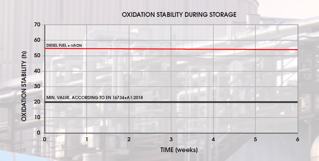 The feature that distinguishes the nitrON package from other products of this type available on the global market is its unique formula, which allowed to combine properties seemingly impossible to combine. Fuel blends with FAME (Fatty Acid Methyl Esters) tend to degrade faster as a result of the fuel biocomponent being more susceptible to oxidation. It is known that cetane improvers also tend to have a negative impact on the oxidation stability of diesel fuel. The products of the oxidation reactions occurring in fuels are substances that may compromise the proper operation of engine, especially the HPCR injection systems. Diesel fuels enriched with the addition of nitrON additive, stored for 6 weeks at 43 ° C, showed an excellent oxidation stability throughout the entire duration of the study (Rancimat® method).
