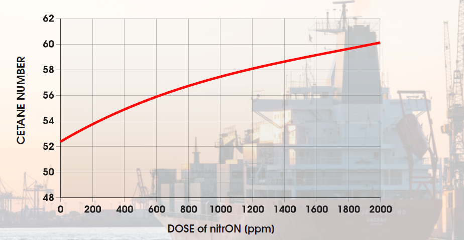 The optimal level of nitrON dose used to increase the cetane number of the fuel depends, among others, on the base cetane number of the fuel (BCN). To help our customers make the most of nitrON additive, the effect of the additive dosage on the cetane number of the fuel is presented below (diesel fuel with BCN of 52.3).